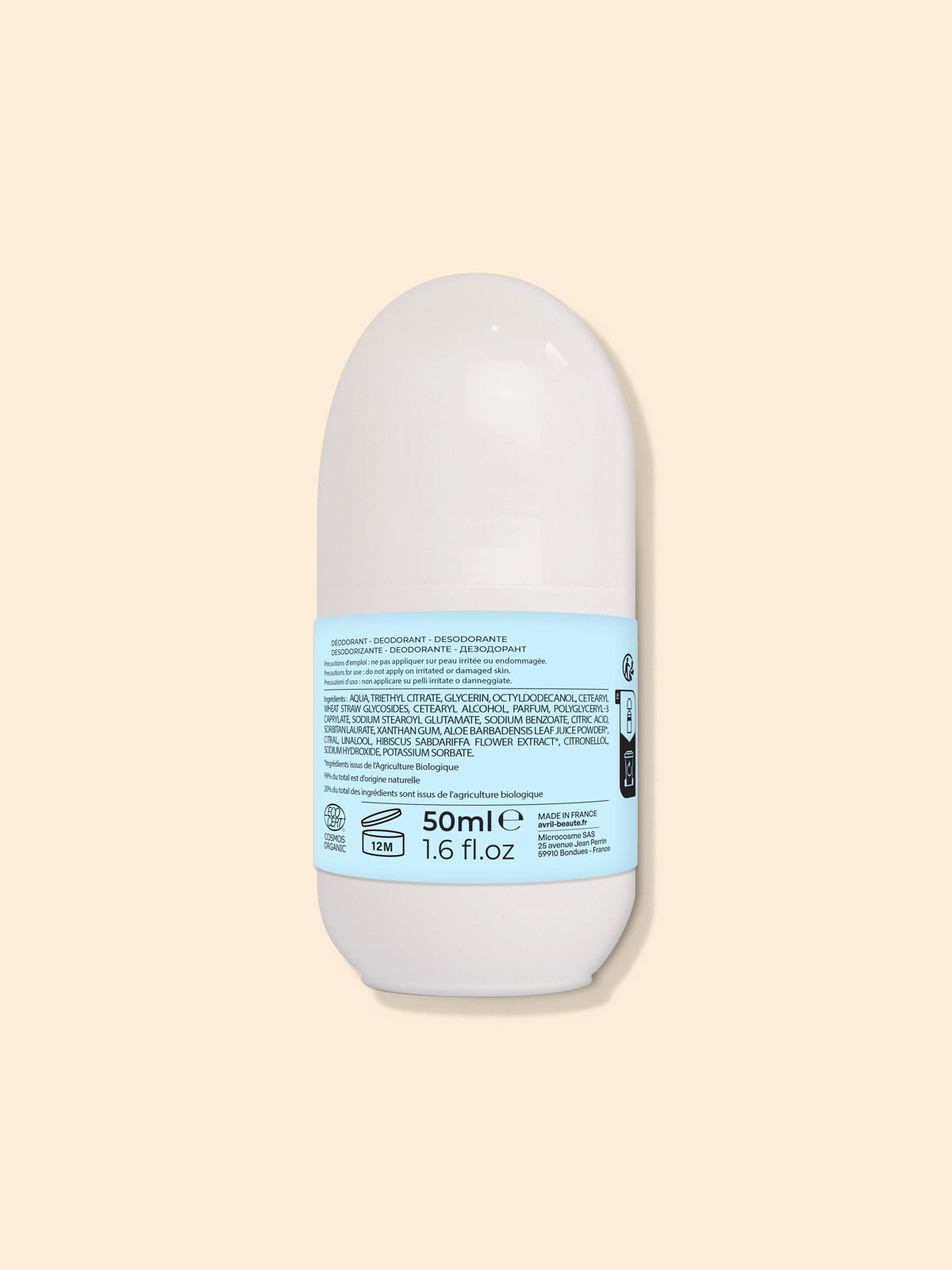 Lăn Khử Mùi Hữu Cơ Avril với chiết xuất hoa bụp giẩm đỏ hữu cơ giúp khử mùi hiệu quả suốt 24 giờ, đồng thời dưỡng ẩm và làm dịu vùng da dưới cánh tay. Sản phẩm không chứa paraben, đặc biệt không chứa Muối Nhôm - thành phần nguy cơ gây Ung thư vú và Alzheimer